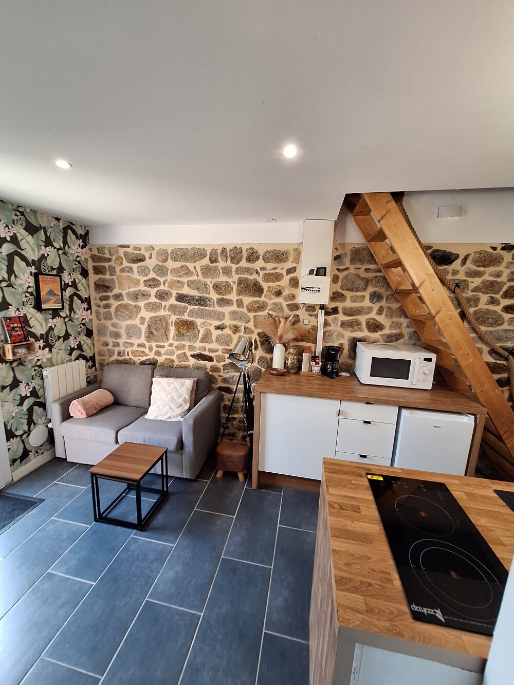 Maison de Pays en pierre Au RDC - Une pièce principale d'environ 30 m² avec cuisine, salle à manger/espace salon, buanderie A l'étage : - Deux chambres d'environ 10m² avec placard ✓ la première avec 1 lit de 160x200, ✓ la seconde avec 3 lits de 90x190 dont 1 gigogne - W.C. - Salle d'eau (douche). Extérieurs : - Terrain clos 100 m² dont terrasse d'environ 25m² avec salon de jardin, barbecue et parasol. - Espace pelouse d'environ 75 m² avec trampoline d'avril à septembre. - Parking privé.