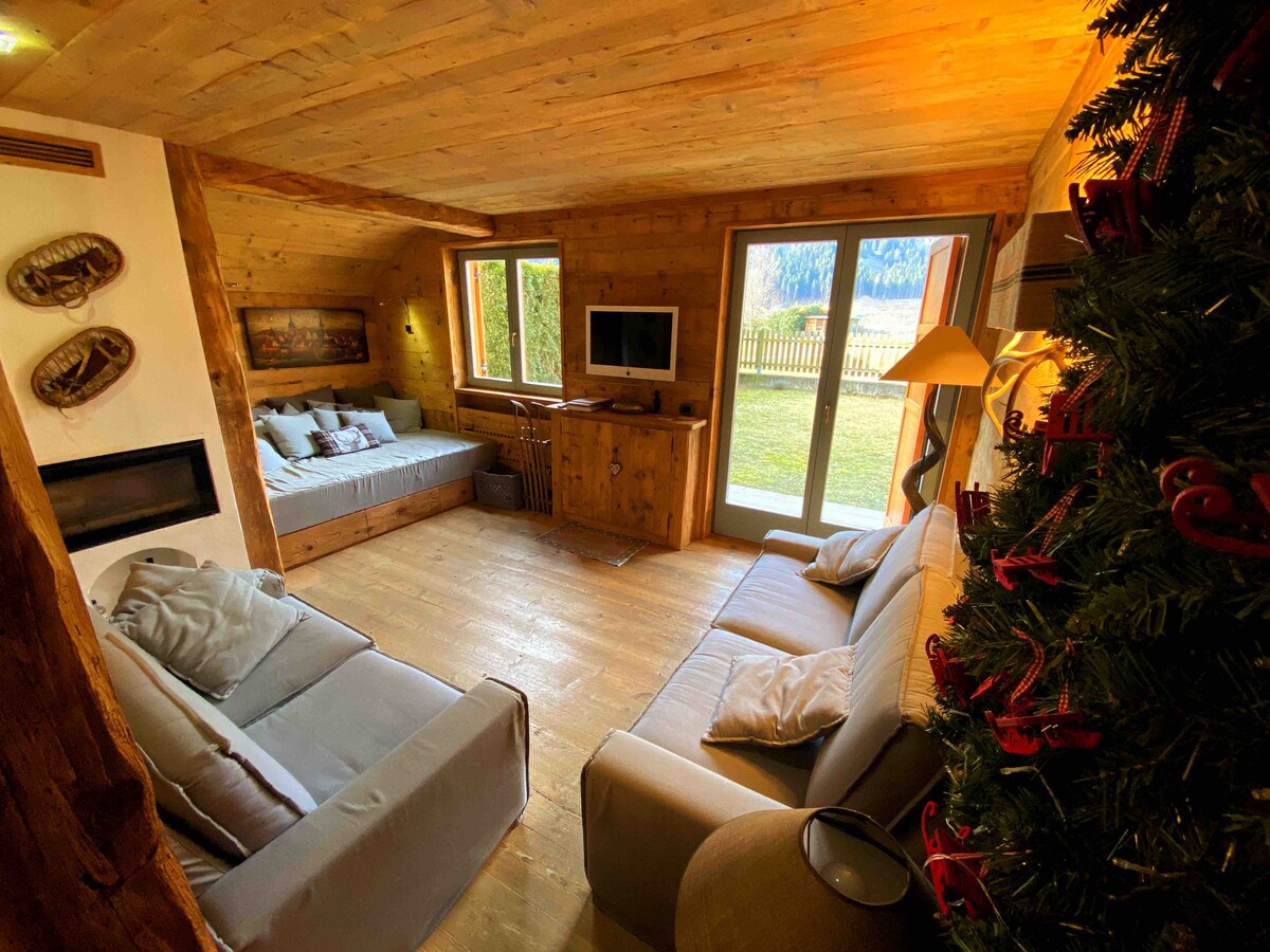 Prestigious property: the ideal solution for unforgettable family holidays. This splendid accommodation, carefully furnished with attention to every detail, seamlessly combines modern style with alpine elegance. The warmth of wood harmonizes perfectly with the cool tones of steel and the shades of gray, creating a welcoming atmosphere rich in style and taste. The apartment features a spacious living area with a fireplace, Smart TV, and a sofa bed that can accommodate two guests.