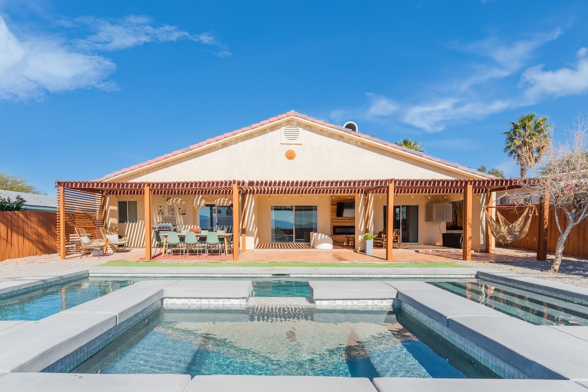 Bienvenido a Palm Peach, una fiesta en el desierto inspirada en Wes Anderson llena de colores y personajes, perfecta para 8 huéspedes. Toma el sol en tumbonas hechas a mano junto a la piscina en un patio trasero estilo resort. Sumérgete en la gran piscina de agua salada. Disfruta de un spa caliente bajo las estrellas. O reúnete alrededor de la chimenea para evitar los escalofríos. Experimenta una sala de juegos y teatro con luz negra única con un mural de luz negra, una mesa de billar de 8 pies, karaoke, juegos de Los Simpsons y mucho más.