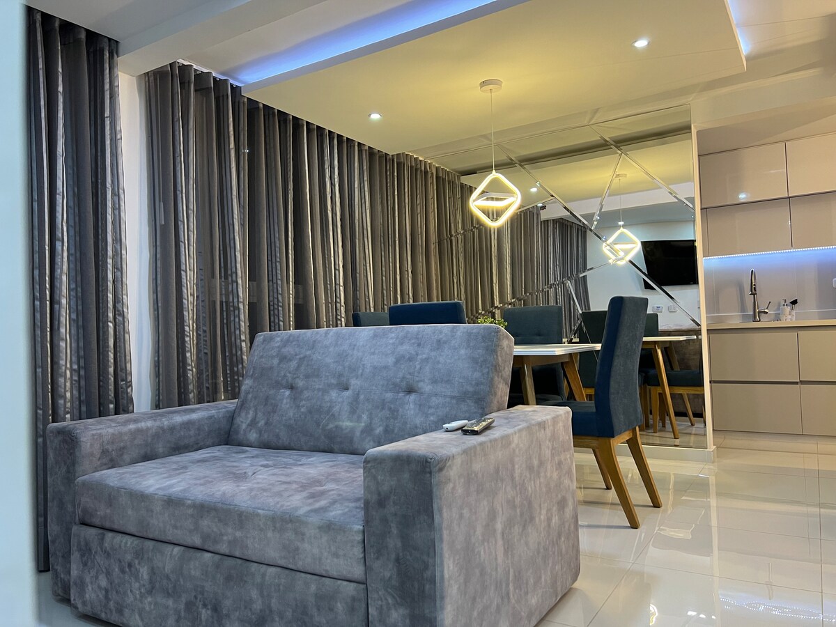 Siéntete en tu hogar, hermoso apartamento inteligente, totalmente nuevo, piscina*, muy tranquilo, contaras con cocina totalmente equipada, Lavadora, cafetera, utensilios de cocina. A 1 cuadra de la vía 40 y a tan solo 500 MT estarás en el Malecón del rio, Caimán del rio y el centro de convenciones Puerta de Oro, a 10 minutos en 🚗están los principales centros comerciales del norte de B/Quilla, parqueadero en la calle. Vigilancia 24 horas. LUGAR NO APTO PARA FUMADORES