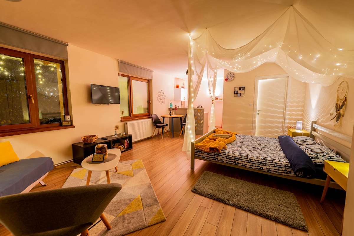 Welcome to the newly renovated urban oasis in the heart of Brasov's vibrant city center. Experience a peaceful retreat with Bali inspired decor and modern comfort. Just 350 meters from historic landmarks, trendy cafes, and artisanal boutiques, including Council Square, Rope Street, and the Art Museum.