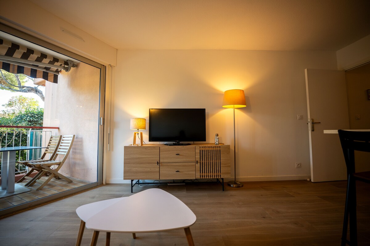 Clasificado como alojamiento turístico amueblado 3 * Wifi desde este año A 350 m de todos los comercios: carnicería, panadería, supermercado, farmacia, 2 mercados por semana, verduras frescas todos los días Personal de salud Restaurantes frente al mar A 10 min, playas de arena, sendero de los aduaneros, calas Apartamento en planta baja, recién decorado, mobiliario interior y exterior recientemente instalado, en un parque muy bien arbolado. En la copro disponible, pista de tenis, cancha de bolos, piscina.