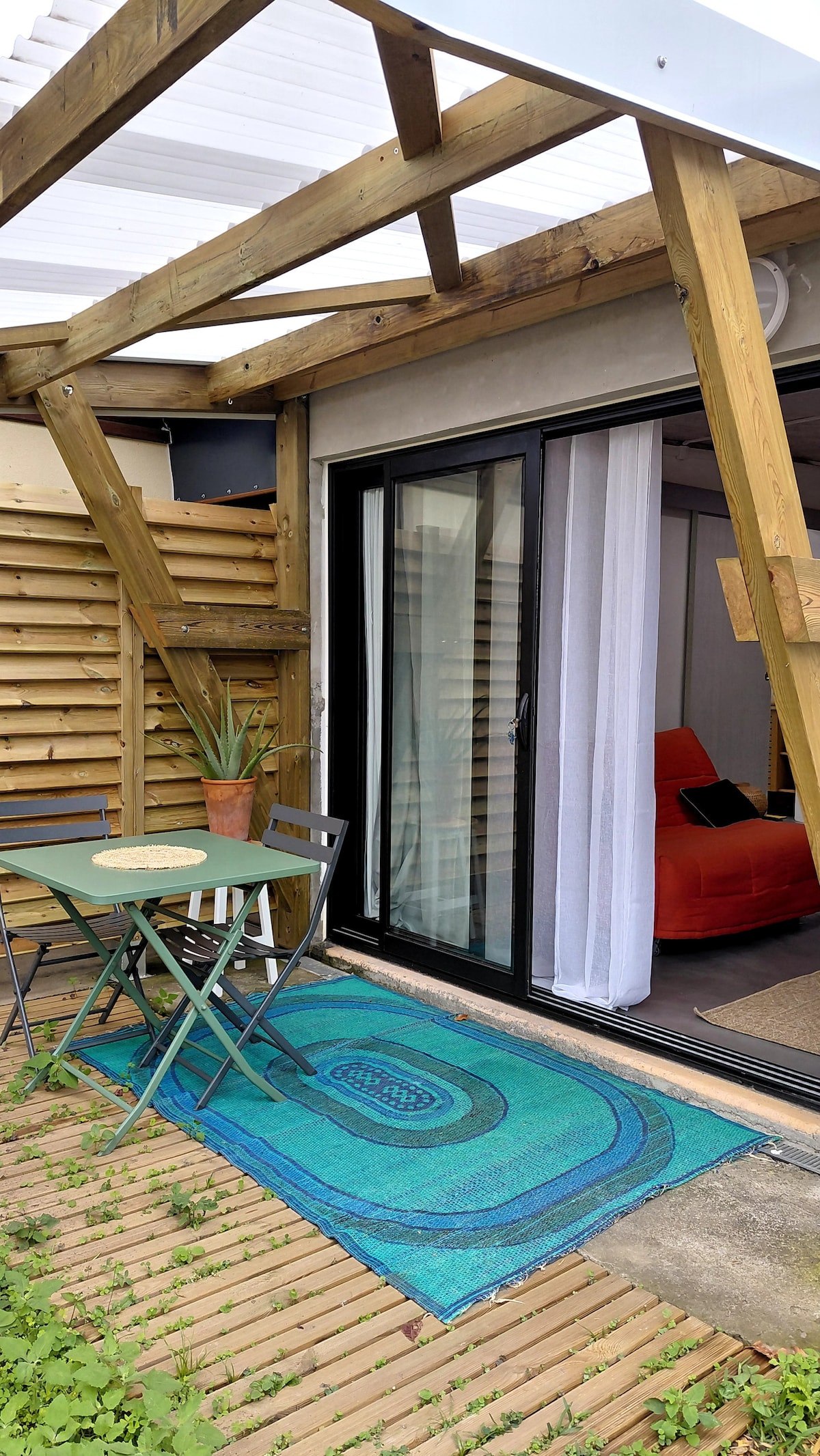 Estudio moderno con pequeña terraza privada en un entorno verde de 950 m2. El lodge climatizado, totalmente independiente, accesible por tres escalones, tiene vistas a la piscina climatizada por paneles solares. Wifi gratuito, ropa de cama incluida. Situado en una zona tranquila y residencial, el acceso es sencillo y rápido. Se puede aparcar en frente de la casa. El acceso al albergue se realiza a través de un camino de circunvalación y un portón independiente.