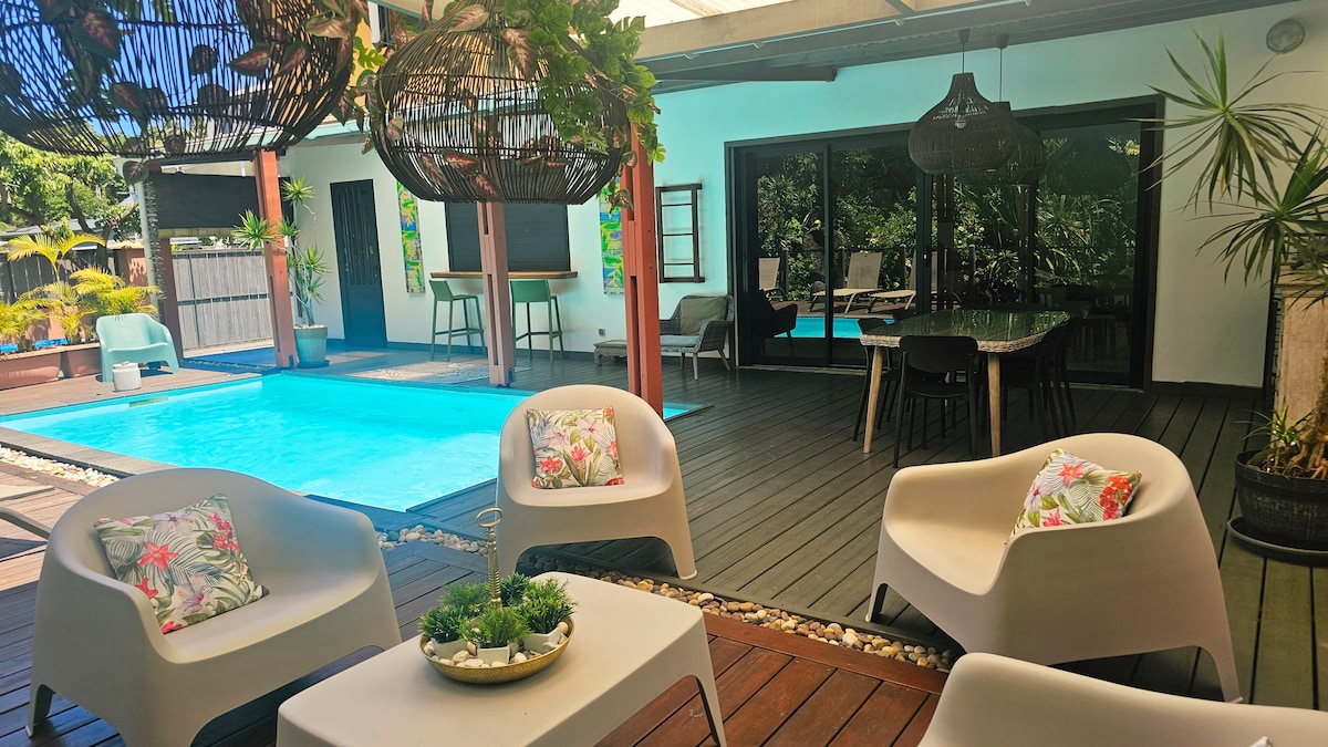 Buscando un pequeño rincón criollo original o un poco fuera de lugar en un ambiente familiar criollo, Vien a zot = ¡Bienvenido! Equipado con 4 ambientes para una superficie de 30 m2, a saber, un dormitorio con aire acondicionado con cama de 2 plazas + 1 cama supletoria, 1 armario, 1 cómoda y 2 lámparas criollas, una ducha italiana, un inodoro, un lavabo (lavarropas opcional a 5 euros) y un pequeño patio. Con cocina abierta. Así como una terraza cubierta con vistas a la nueva piscina privada de agua salada de 20 m2