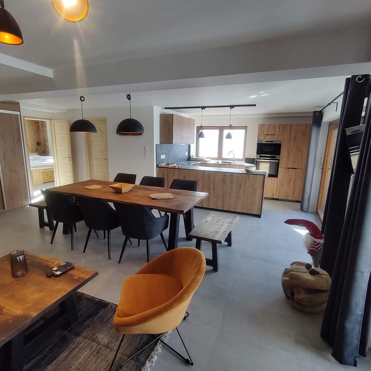 Apartamento nuevo y espacioso de 80 m² adaptado para personas con movilidad reducida con capacidad para 8 personas en un chalet en medio de las pistas de St Sorlin. Consta de - 1 gran sala de estar con cocina totalmente equipada, decoración acogedora, vistas a la montaña y al pueblo - 1 suite principal con baño con ducha a ras de suelo + WC - 1 habitación espaciosa con cama doble + 1 cama individual - 1 habitación con 3 camas individuales - 1 cuarto de baño con bañera - Aseo separado - Gran terraza - balcón orientado al este - Armario de esquís - Local para bicicletas.