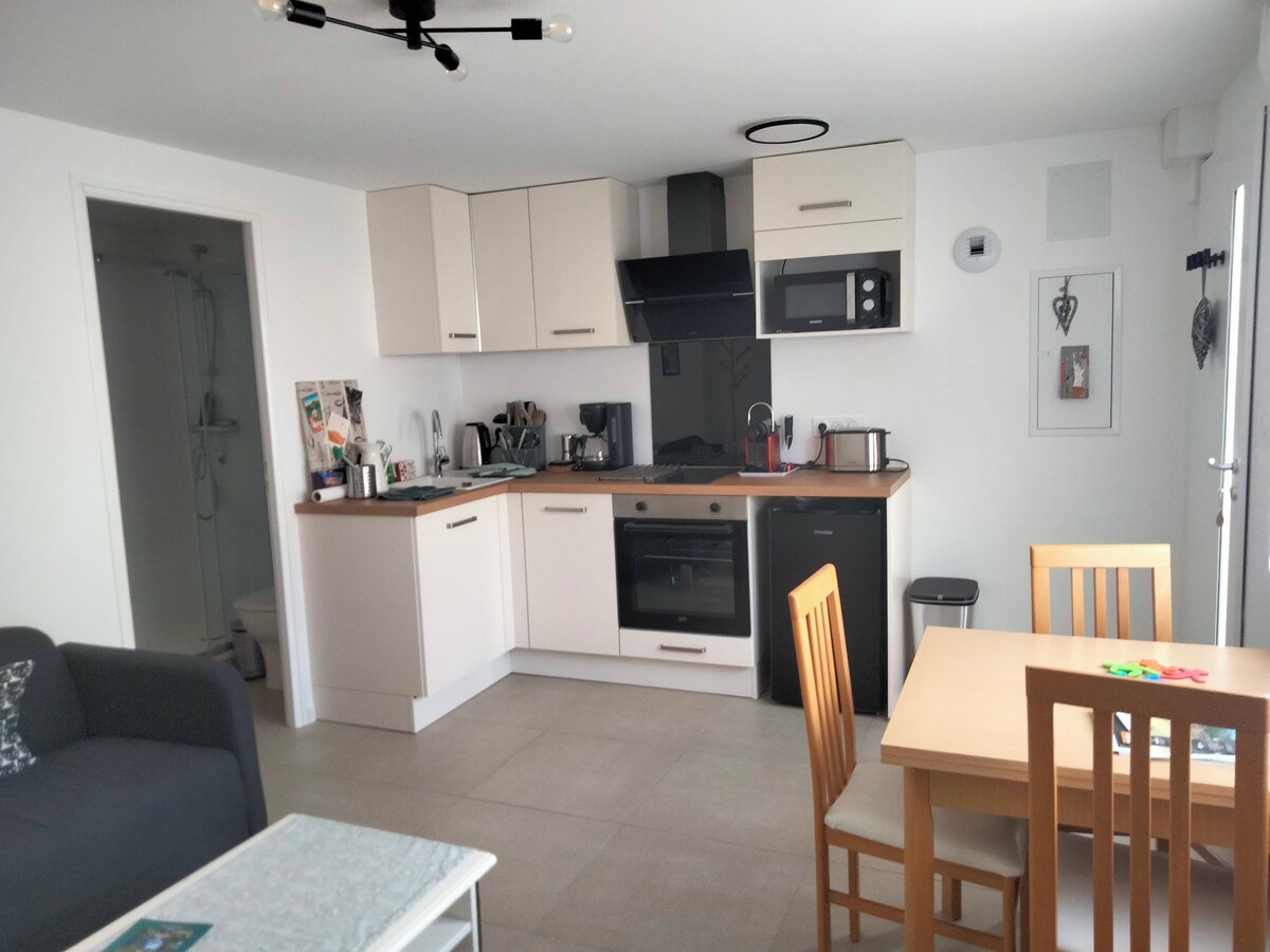 En el corazón de los volcanes de Auvernia, pequeña casa en un entorno verde; 30 metros cuadrados con: - cocina equipada - amplio baño con toallas incluidas - sala de estar equipada con sofá cama En el primer piso, entrepiso: - cama doble - pequeño escritorio - armarios En el exterior: - espacio de estacionamiento - terraza equipada Recibimos por la noche, la semana o el mes. La casita se encuentra en el patio de nuestra propiedad en Rouillas-Bas en el municipio de Aydat.