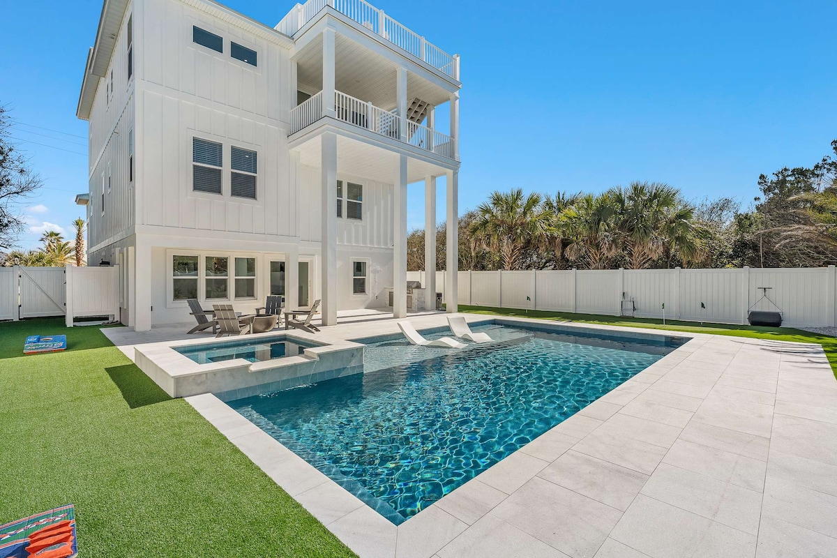 Seaclusion is a luxury, designer home complete with top amenities for endless fun and relaxation. ->Outdoor haven with heated pool/spa, grill, putt putt, firepit and more! ->Pool/Spa Heat Available for $40 per day - Contact for Details ->Roof Deck dining with direct sunrise and sunset views ->Kids dream bunk room ->In- home entertainment including arcade games (Mortal Kombat, Golden Tee, & Pacman), cornhole, and table tennis ->Directly across from beach access ->Elevator for all 3 floors