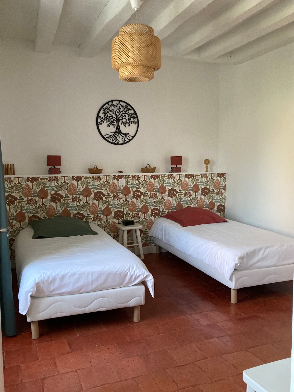 Alojamiento contiguo al del propietario a 400 m de uno de los más bellos bosques de robles de Europa. Casa familiar restaurada con materiales saludables (tierra, cal, madera local, cáñamo, baldosas...) En la planta baja, una sala de estar de 26 m2 equipada con una cocina completa y una estufa de leña, sofá cama para 2 camas adicionales y baño con gran ducha italiana, lavabo e inodoro. Arriba hay un gran dormitorio de 25 m2, cama de 160x200 y 1 cama individual + una cuna.