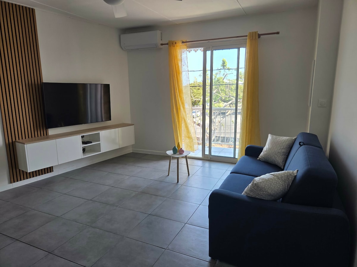 Jolie T2 cosy de 45 M2 au front de mer de St Paul, séjour climatisé ouvert sur la cuisine, une chambre climatisée, douche à l'italienne avec WC, grande varangue pour pour profiter d'un moment convivial et de détente en couple. Appartement trés bien situé, tout à proximité, marché forain, ballade parcours de santé, restaurants, snack bar. La route des tamarins à 5 minutes direction les plages de l'ouest et le sud sauvage. Plaisir et moment garanti.