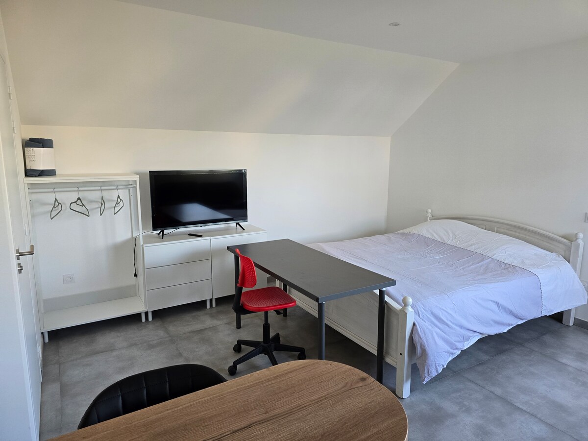 Relájese en este alojamiento tranquilo , vacaciones, fin de semana . trabajadores, VRP . Equipado con una cocina, con placa vitrocerámica, nevera, congelador, microondas y horno. Desayuno bajo petición Salón: sofá cama, TV, Wifi gratuito Entrada independiente por una escalera en una cristalera, cuarto de baño con ducha de 90x90, un lavabo sobre un mueble, secador de toallas aseo independiente. En el exterior, muebles de jardín en un patio reservado para los huéspedes. Barbacoa. Bonito paseo a pie