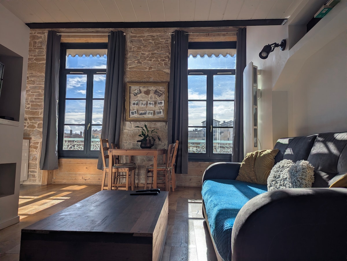 Authentique canut de 250 ans, cœur Croix-Rousse, cosy & calme. Plongez dans l'histoire d'un immeuble lyonnais du XVIIIe siècle. Ce canut aux pierres apparentes et plafond lyonnais offre une ambiance chaleureuse, baignée de lumière plein sud. La pièce de vie réunit un salon, une cuisine équipée et un coin bureau dédié avec wifi fibre rapide – idéal pour télétravail ou séminaires. À 1 mn du métro, vous êtes entouré de marchés, bouchons et boutiques, tout en profitant d'un calme absolu la nuit.