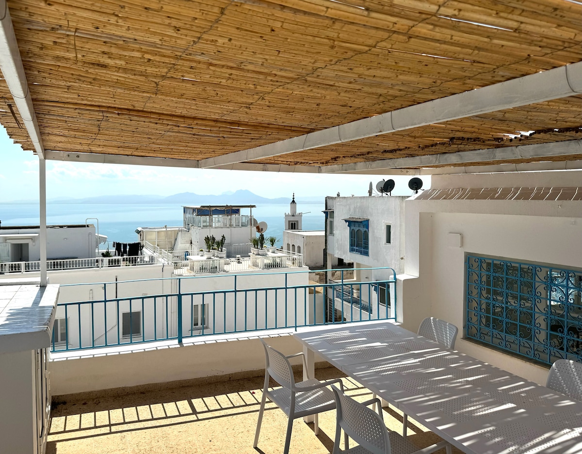 En Sidi Bou Saïd, en un remanso de silencio y luz, este gran luminoso S1 mezcla tradición árabe-andaluza y comodidad moderna. Chimenea, terraza florida, arcos, zelliges y muebles artesanales crean un ambiente único. Cocina equipada, Wi‑Fi de alta velocidad,TV con todos los canales ,películas y series, ropa de cama cuidada. En 15 minutos a pie: callejuelas azules, cafeterías, mar y sabores locales. Ideal para crear, reponer energías, evadirse o simplemente respirar.