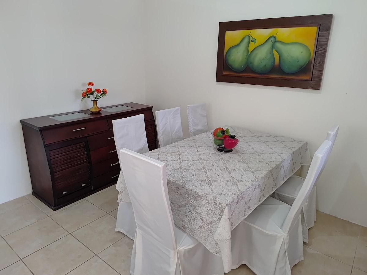 Relájate con toda la familia o grupos de amigos en este tranquilo lugar para quedarse y estar. A dos kilómetros de la playa y un jardín interior con árbol de Guayaba que da sombra, cambiando el clima del entorno por lo frondoso de sus ramas y el canto de los pájaros cada mañana musitando un nuevo día. Villa funcional y práctica con AC, parqueo.