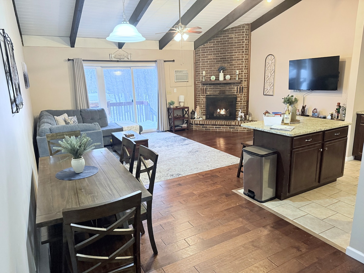Ski slopes open on December 15! Bring the whole family and friends to our stylish, cozy unit, just a walk away from ski slopes, water parks, indoor pool, tennis courts, sauna, hot tub, and more. Enjoy the local villages, with the nearby hiking trails, waterfalls and breathtaking scenery, nearby casino. Indoors you have cozy living area with a wood fireplace, 3 large screen smart TVs, super fast WiFi. Get comfortable with central AC for hot weather days and a fully equipped kitchen for cooking.