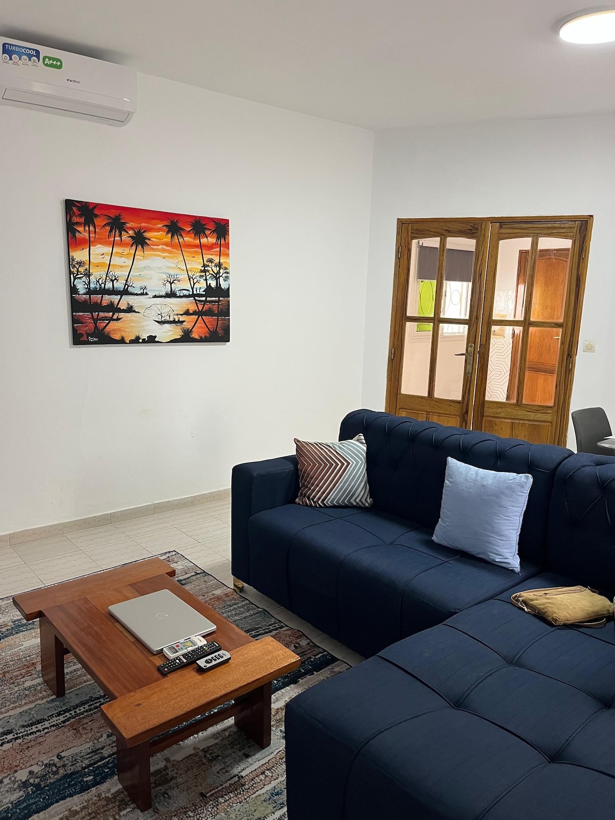Hermoso apartamento luminoso de 60 m2 en alquiler en el primer piso de una villa privada situada en Saly Niakh Niakhal en una zona residencial tranquila a 200 m de la playa, y a 10 minutos en coche del centro de Saly. Entrada privada e independiente de los propietarios instalados en la Planta baja. Es el lugar ideal para una pequeña familia o amigos.