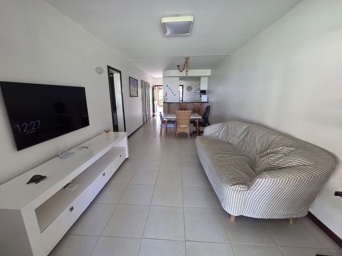 Apartamento en condominio cerrado con hermoso paisajismo en Praia do Forte. El condominio cuenta con piscina, sauna, gimnasio y acceso exclusivo a la playa. Tenemos wifi, tanto en el apartamento como en la zona de la piscina del condominio. Contamos con una plaza de aparcamiento y también plazas de visitante (sujeto a disponibilidad) y un portabicicletas.