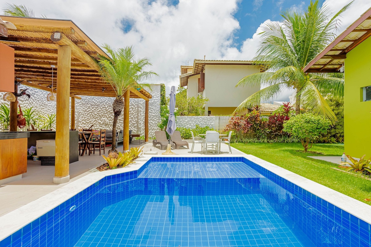 Desfrute do melhor de Jacuípe nesta casa de alto padrão, a 250 m do encontro do rio com o mar. Com 8 suítes climatizadas, acomoda até 18 adultos + 4 crianças em 952m² de conforto, área de lazer inclui piscina com cascata e churrasqueira, ideal para momentos inesquecíveis com família ou amigos. Próxima ao melhor banho de mar da Linha Verde, é perfeita para quem busca privacidade, tranquilidade e contato com a natureza. Reserve agora e viva essa experiência única