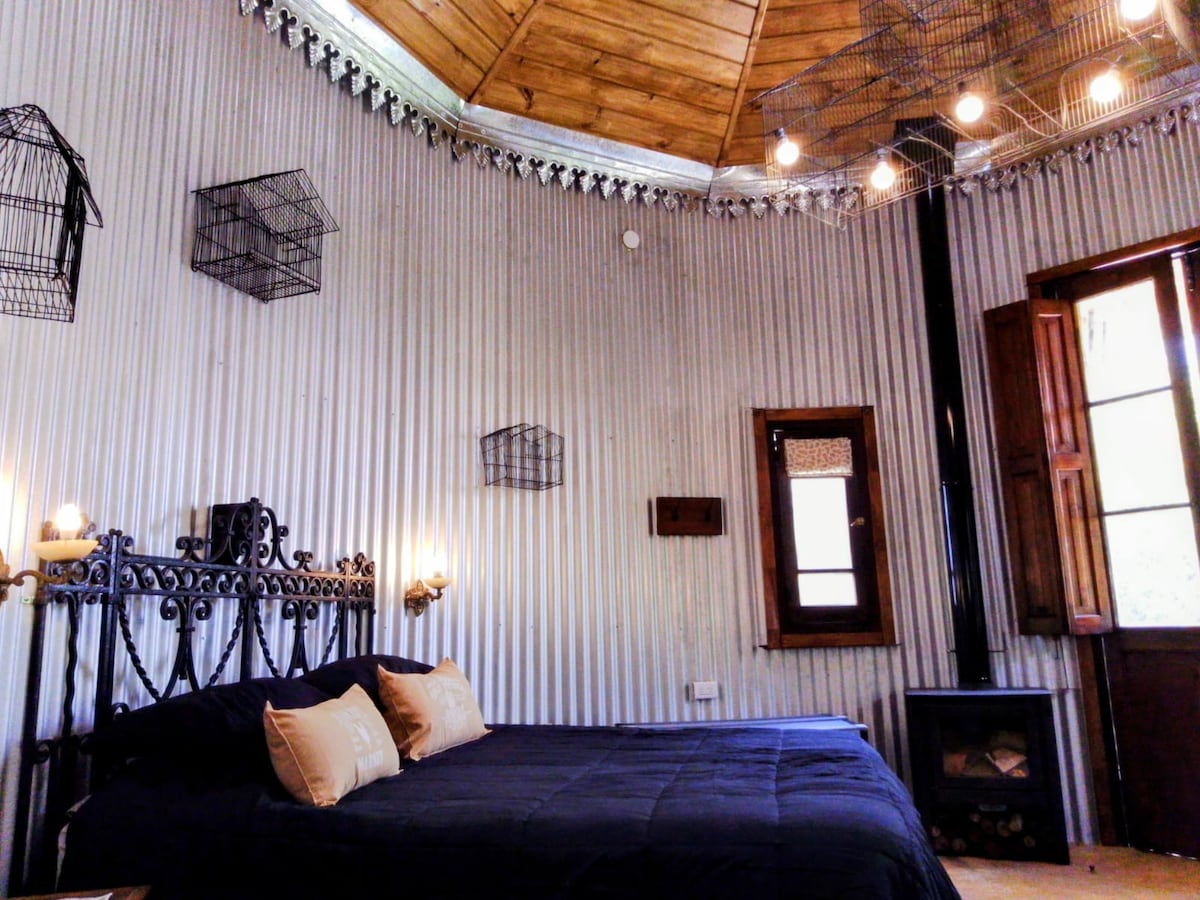 40 años juntó granos en Hernando. Hoy, después de un año de reformas, nos aloja. Los granos del mundo somos nosotros. Baño, agua caliente, cocina, cochera, parrilla, todo eso promedio de una casa, pero en un silo redondo de 5.5 de altura, con seleccionadas aberturas antiguas, una micro piscina tipo estanque con playita, un túnel solar en el techo. No es una casa, es un silo. Te vas a alojar en un silo a 1400msnm. Tenemos perros, gatos, patos, gallos, cabra y gallinas. Ninguno hace daño.