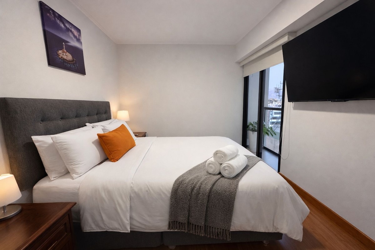 ¡Vive Lima desde el piso 20 con una vista increíble! 🛏️ Cama KING 📺 TV de 65" 🛋️ Cómodo sofá 🍳 Cocina equipada 🏊 Piscina, 🔥 BBQ y 🍸 Lounge Bar (según disponibilidad) 🚗 Estacionamiento por USD 8/noche (según disponibilidad) 🧳 Guarda maletas antes del check-in o tras el check-out Ubicación top entre Miraflores, San Isidro y Surquillo Teniendo 4.96⭐️ y siendo Superhost, te ofrezco una estadía cómoda y segura. ¡Reserva y disfruta Lima desde lo alto, con estilo y confort!