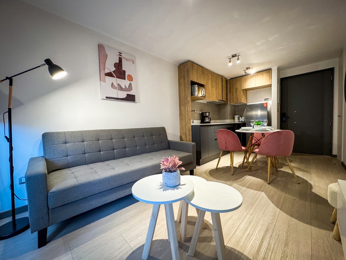Apartamento moderno elegante y productos excelente calidad, con un diseño acogedor, aire acondicionado, cocina equipada, WiFi rápido y un cómodo dormitorio más sofá cama. Ubicado en el corazón turístico de Santiago, cerca de restaurantes, museos y atractivos imperdibles. Ideal para viajes de placer o trabajo, con todo lo necesario para una estadía cómoda y conectada.