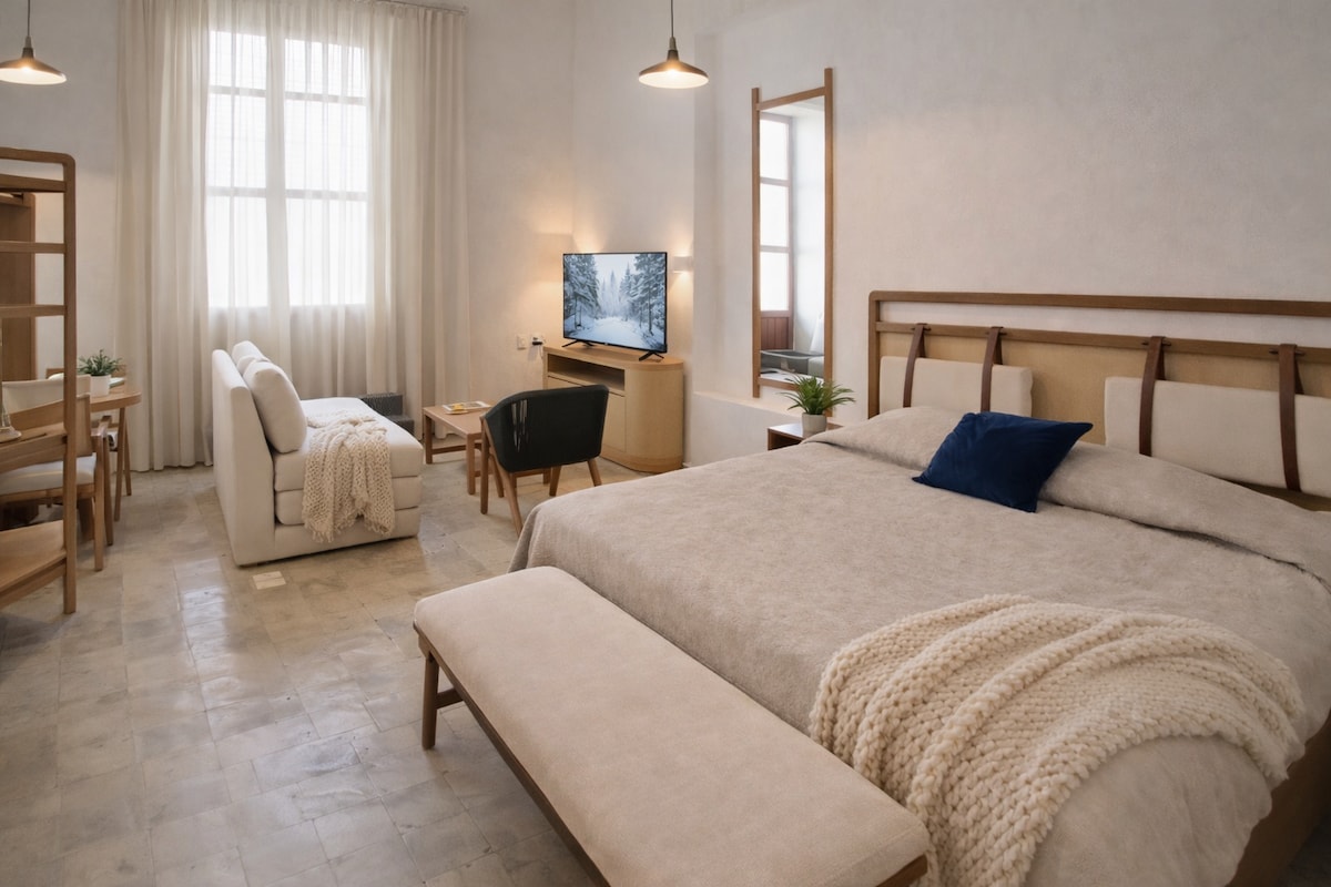 Hermoso espacio en el corazón del Centro Histórico de Puebla, donde la historia se encuentra con la modernidad, esta construcción restaurada conserva elementos originales, ofreciendo un ambiente único, tranquilo. El espacio cuenta con una ventana con vista al parque/calle, en ciertas fechas es posible que se perciba ruido propio de la ciudad. La estancia Incluye ÚNICAMENTE limpieza al finalizar su estancia. Puede solicitar limpieza con costo por ocasión. Se llevaría a cabo entre 3 pm y 4 pm.