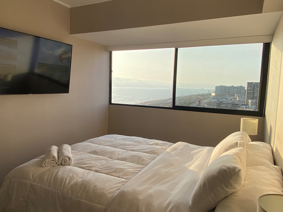 El Departamento esta ubicado cerca al aeropuerto y a 15 minutos de Miraflores por el circuito de playas ,puedes disfrutar de una vista al mar desde todos los ambientes ,contamos con servicio de transporte y tenemos soporte al huespede 24/7. . El departamento está totalmente equipado , agua caliente de alta velocidad, Wifi , 2 TVs de 55’ y cuenta con una piscina panorámica en el ultimo piso , así como sauna y gimnasio .
