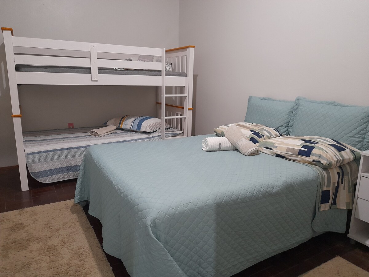 Casa em meio a um agradável bosque, com 1 quarto amplo e todos os ambientes climatizados. Oferece TV, Wi-Fi, Netflix etc. Cozinha com fogão, micro-ondas, torradeira, churrasqueira, fogão à lenha e geladeira; área de serviço com máquina de lavar roupas. Acesso independente da casa principal, em 5000 metros de área verde, lago, quadra de basquete etc. Colecionamos frutas, são 60 tipos que você poderá apreciar de acordo com a estação do ano. Comporta 6 pessoas em camas e até 8 em colchões extras.
