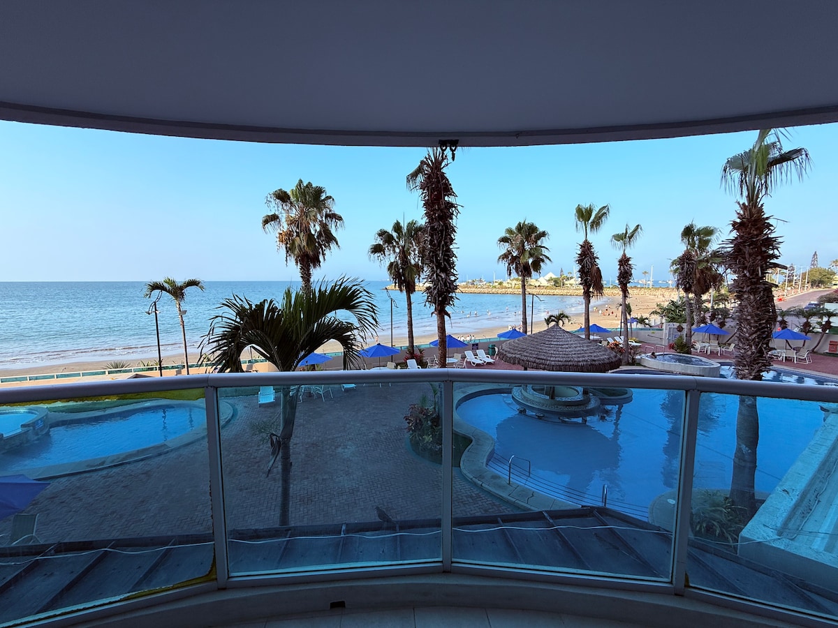 Frente al mar con seguridad 24h en la urbanización, playa y parqueo. Acorde con el sonido del mar, tome café con la brisa entrando por la ventana y sienta que el tiempo paró ♥ ⭐Incluye: • 3m caminando a playa • Parqueo y vistas 360° • WiFi 600Mb • Piscinas, jacuzzi y zona BBQ • Cuartos con A/C, agua caliente y cortinas • TV: Netflix, Spotify & Alexa • Airfryer, cafetera, micro, refri y cocina • 3 baños, cuna, Petfriendly, ascensor • Toallas, ropa de cama y papel • Guardias, y cámaras 24h