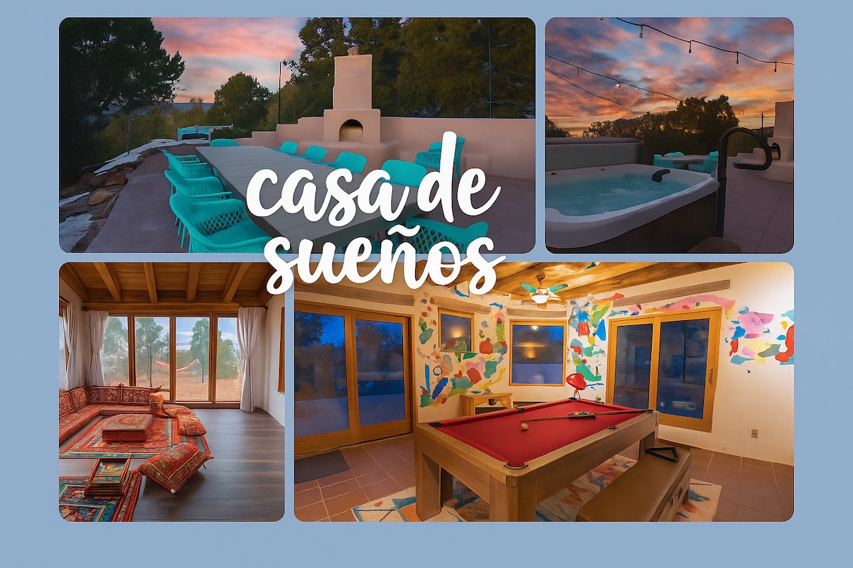 We crafted this loving space that radiates warmth and positive energy :) Enjoy this 4-bedroom (including 2 master suites), w/ 3 bathrooms. Upstairs master offers a private deck. Enjoy the private Spa Zone featuring Jacuzzi, Cold Plunge, & Infrared Sauna in the enclosed front patio. This location is in a safe, central area just five minutes from downtown and the plaza, close to Meow Wolf, Ten Thousand Waves, Body Yoga & Spa, and many other attractions. We can't wait to host you!