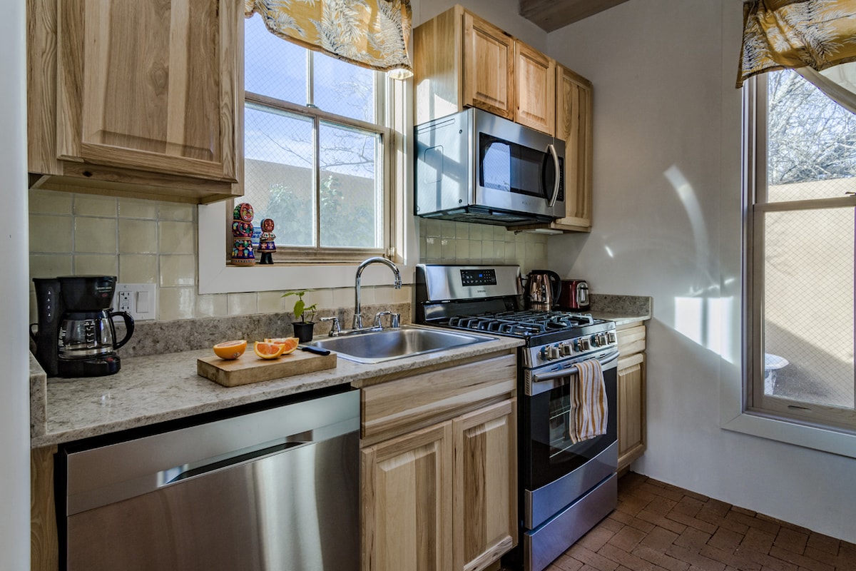 🌜H I D E A W A Y N O R T E: an inspiring & cozy adobe for your high desert adventure 🌵EASY 3 MINUTE WALK to Santa Fe's best restaurants, bars, coffee shops, boutiques, movie theaters, farmers and artisan markets. 🌵Train direct from ABQ + skip the rental car 🌵King + Queen beds 🌵Fast ⚡️ WIFI 🌵Fireplace + AC/heat minisplits 🌵Bonus Sunroom w/couch and TV 🌵Private patio 🌵Full Laundry 🌵KIDS: Pack n’ Play, high chair/booster, toys, books, white noise 🌵DOGS: beds, bowls, gated patio