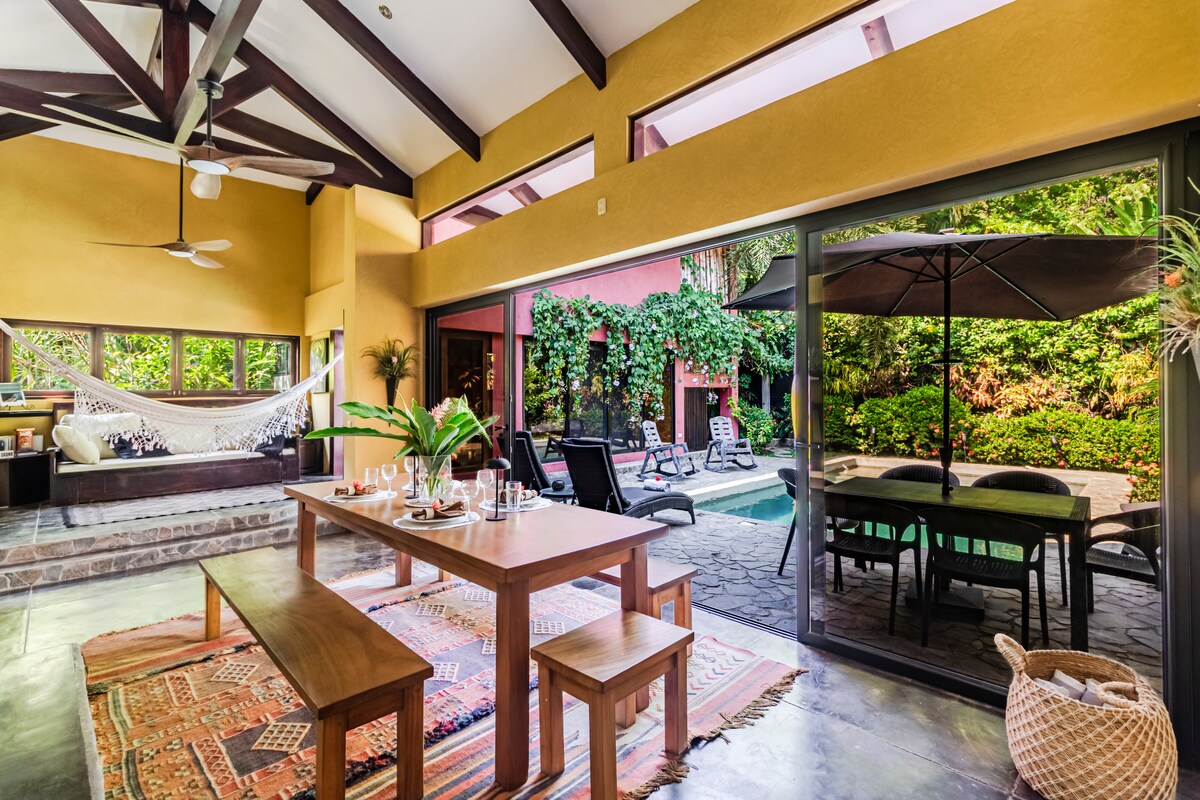 This jungle house is designed for a calm and comfortable stay, surrounded by nature. Built elevated, it features clean and contemporary architecture with natural materials, open spaces, and a strong indoor–outdoor connection. The bright living area includes an office space with large windows and a Pilates studio that opens into the living and dining areas. Ideal for guests who value nature, privacy, serene spaces, and thoughtful design. Very close to the beach and town, yet quiet and peaceful.