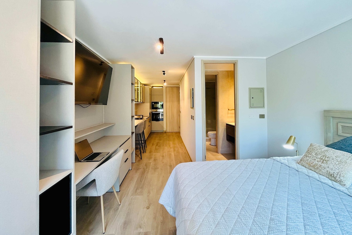 Departamento nuevo con vista al Parque Araucano y cordillera. A pasos del mall Parque Arauco, restoranes, bares, supermercados, bancos y red metro. 1 dormitorio y 1 baño. Sofá/cama o colchón. Walk-in closet, TV con servicios de streaming. Cocina equipada. Escritorio de trabajo. Estacionamiento (de pago). Edificio seguro. Lavandería, piscina temperada, sauna, piscina exterior, gimnasio, quincho para asados y sala de eventos. ¡Minimarket en la puerta y room service para pedidos de comida!