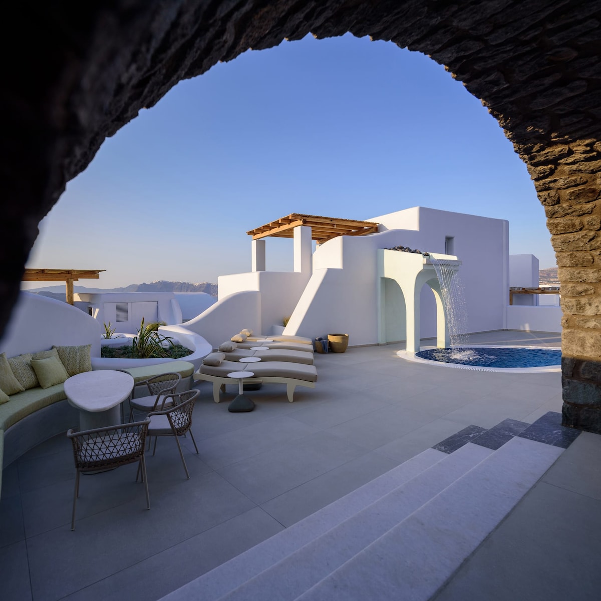 215m² of absolute privacy and unobstructed caldera views. Experience total pampering with a private infinity heated pool, an authentic in-villa Turkish Hammam, 2 Jacuzzis, chef-prepared breakfasts served in your villa and panoramic views of the volcano, the iconic cliffs, Oia and Fira Tucked away on the serene outskirts of Akrotiri, our luxury villas offer rare seclusion. Escape the crowds and enjoy 5-star service in a setting where modern luxury meets the quiet soul of Santorini.