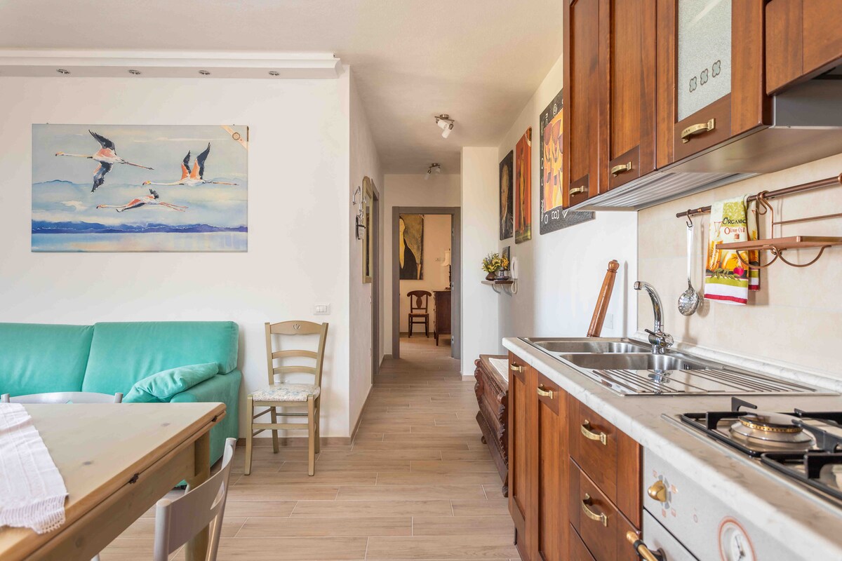 Nuevo apartamento con porche privado y una espléndida vista al jardín. Un dormitorio doble con armario, baño principal con ducha doble, aseo y una gran sala de estar con cocina americana. Mobiliario de diseño con algunos toques de muebles y artesanía sardos. La residencia está rodeada de vegetación a solo 10 minutos del centro de la ciudad, cerca de los principales servicios y playas, pero al mismo tiempo lejos del tráfico y el ruido.