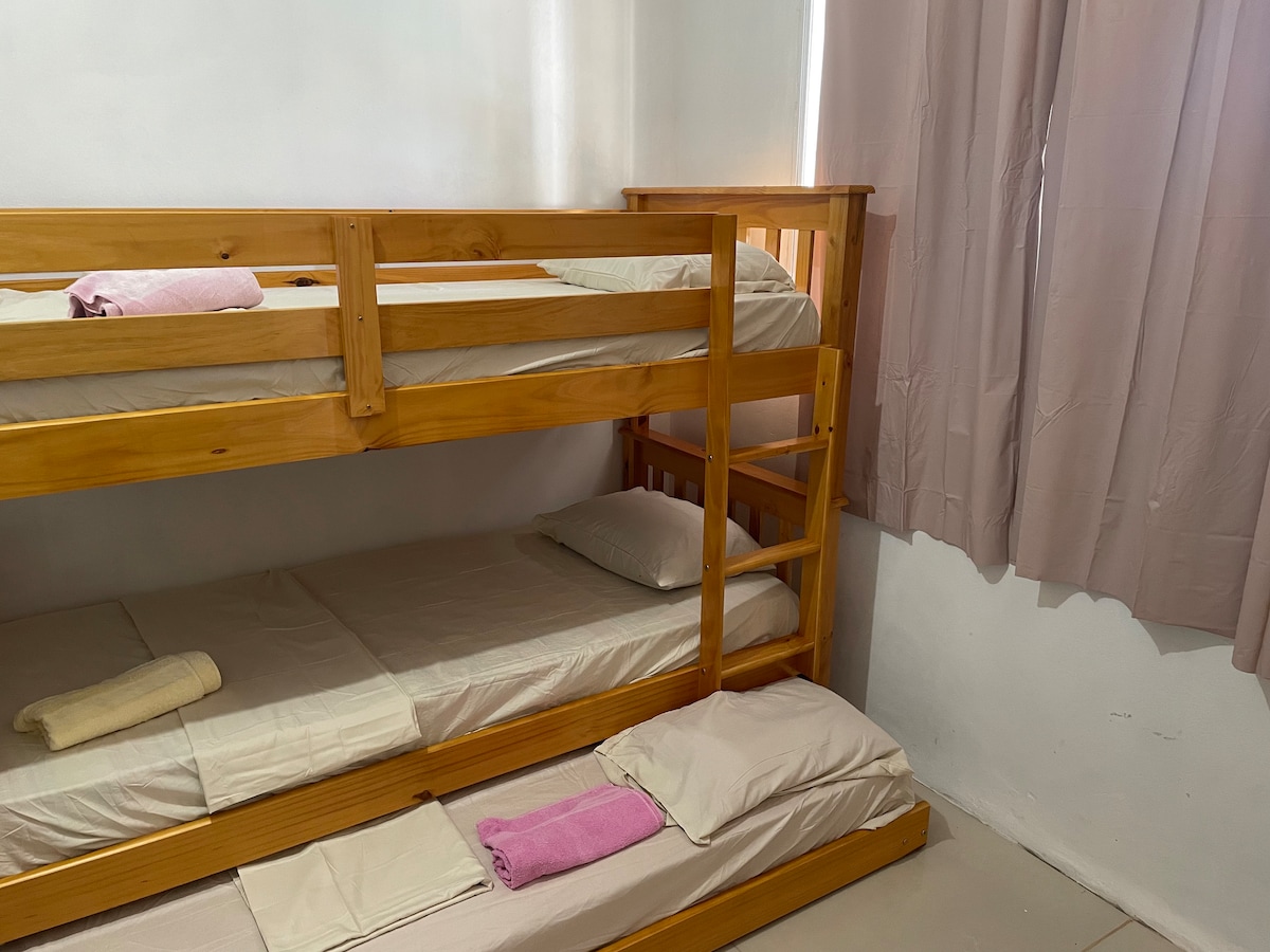 O quarto dispõe de 01 frigobar, 02 ar condicionado, 02 televisões, internet Wi-Fi, 01 cama matrimonial e 02 individuais num quarto e 01 cama matrimonial e 02 individuais (beliche) no outro quarto, tamanho: 39 m2.