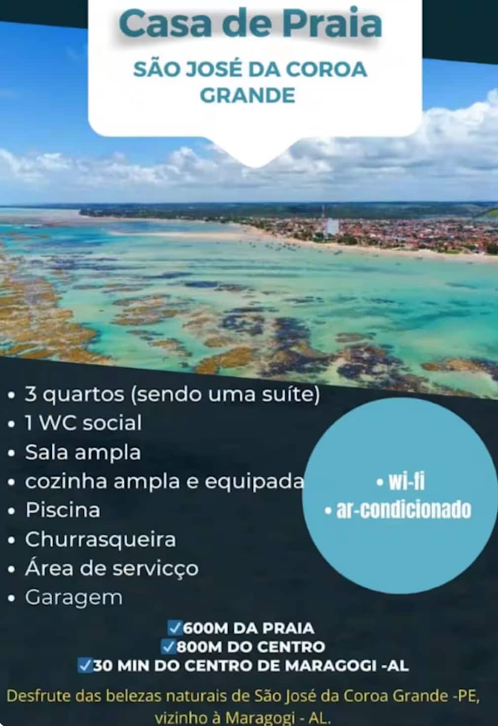 Sua família vai se hospedar na melhor localização da região, seguro e totalmente climatizado (SALA e QUARTO), situado na bela e calma praia de São José da Coroa Grande, a "Terra das piscinas naturais", a 50 metros do mar, com toda comodidade e segurança ao redor, como restaurantes, bares, supermercados e farmácias, estrategicamente ficamos ao lado das badaladas praias de Maragogi ( Antunes, Barra Grande, Peroba) e Tamandaré (Carneiros), destinos bastantes procurados em todas épocas do ano.