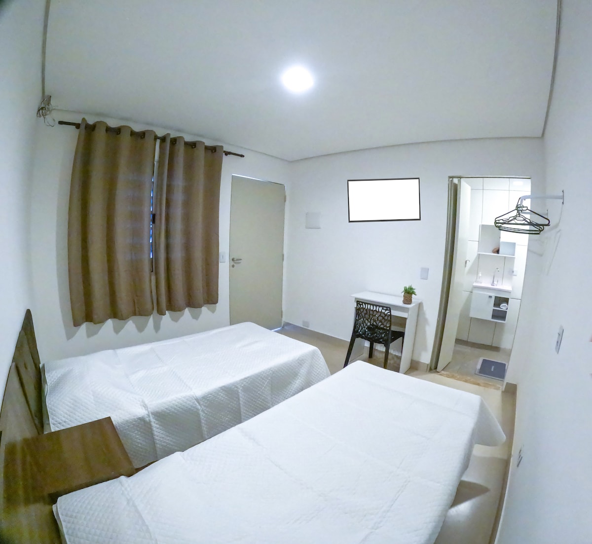 Habitación de 14 m2, cocina americana privada, con microondas, minibar, horno eléctrico de 15 L, cocina de 2 fuegos, electrodomésticos de cocina para la preparación de snacks y comidas pequeñas. Baño privado y entrada independiente. Sin aire acondicionado, pero tiene ventiladores potentes. Habitación para NO FUMADORES, con una multa de 250,00 para aquellos que violen esta regla, pero pueden hacerlo fuera de la casa. El alojamiento de más de 30 días puede usar la lavandería de la propiedad sin costo adicional.