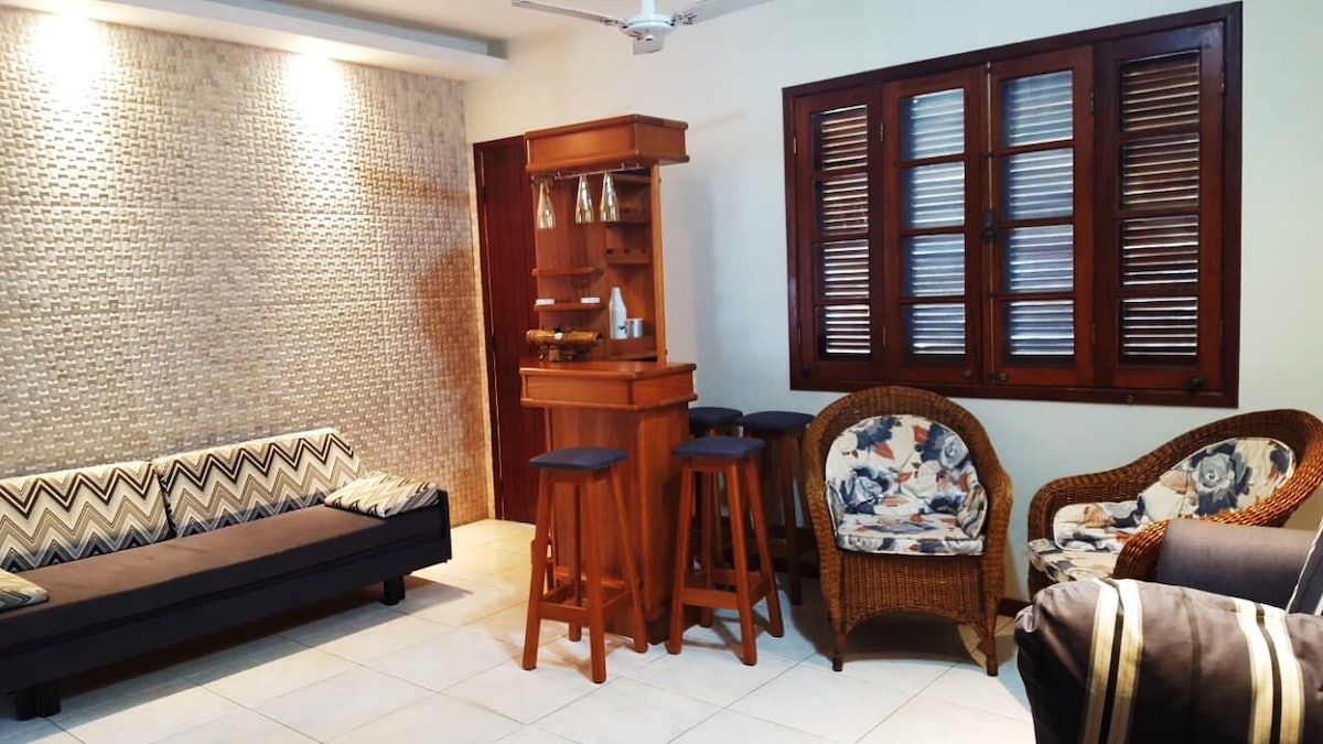 Acogedora casa de playa, toda renovada, con una suite y una sala de estar con dos sofás cama tamaño king, baño social completo, cocina bien equipada y estacionamiento para un auto en el condominio. Además de estar cerca de la playa (2 cuadras), está cerca de un buen comercio (panadería, farmacia, supermercado, restaurantes, etc.) y a 1 km de la estación de autobuses. La casa es ideal para parejas y familias con hijos.
