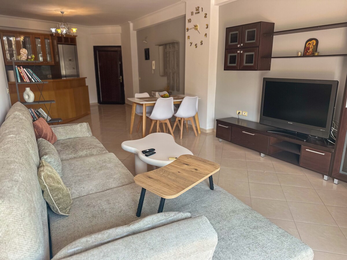Beautiful one bedroom apartment with a big Living room and kitchen in the center of Sarande. Lately renovated with modern furniture and appliances. Beautiful view of the city during day and night. 3 mins away from the beach and the pedestrian walk. Very close to the grocery stores and cloth boutiques. (Note: The building has no functional elevator so be prepared to climb stairs)