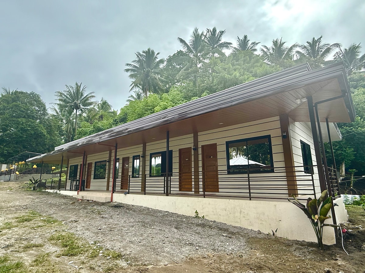 Modern guest suite, a/c, on 2nd floor overlooking the city, built for relaxing convenience, soothing open air winds blowing into the open dining and sitting room, equipped with a/c, hot shower, and a wonderful view of the open air surroundings of the community. Room has sliding doors to open both walls, for optional windy cool nights and fresh air. We have gensets to run 24-hr operations in case of brown-outs.