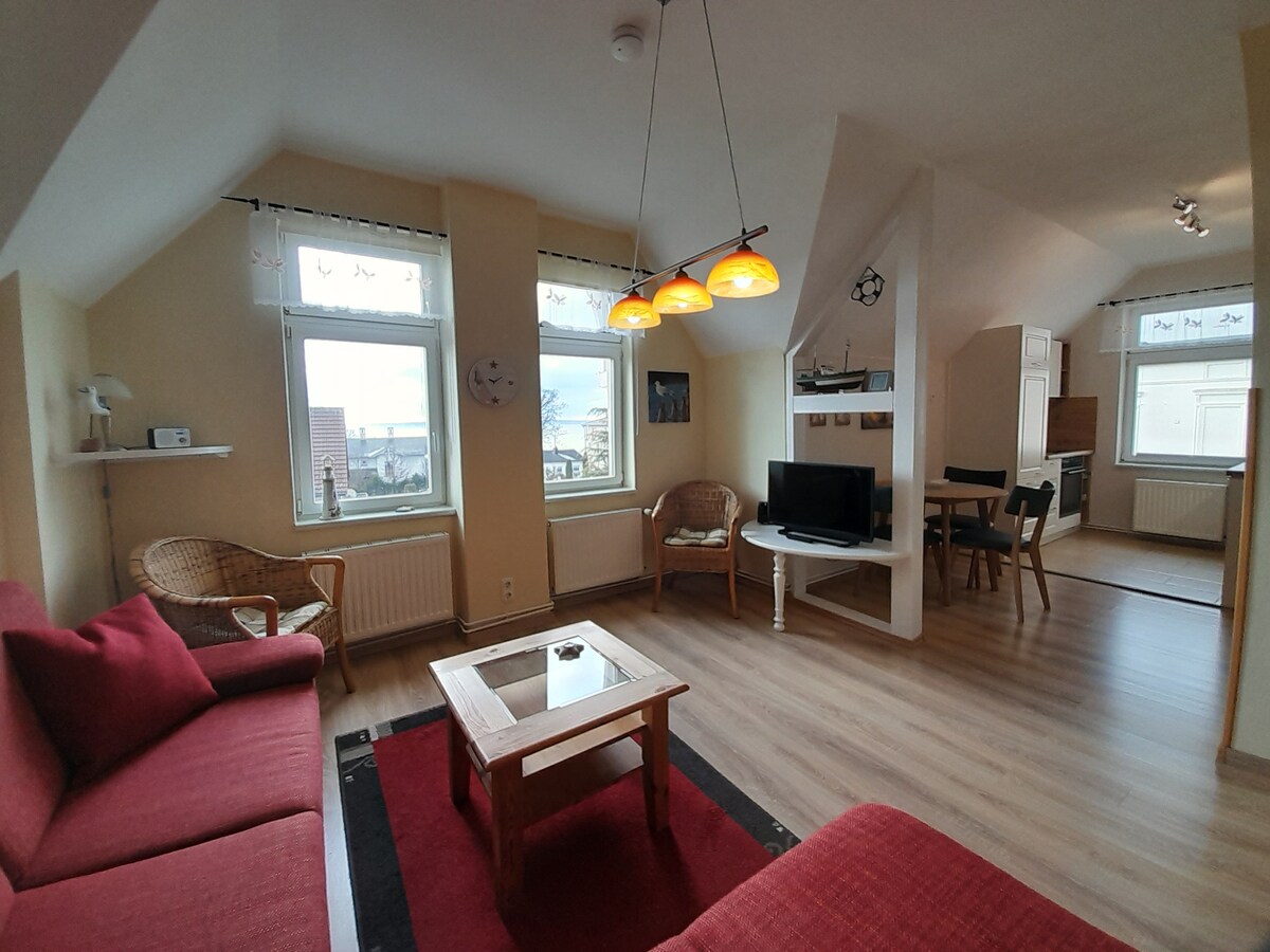 Este elegante apartamento de aproximadamente 50 m² se encuentra en el ático de una casa de dos familias en la ciudad portuaria de Sassnitz, un lugar encantador en la costa este de Rügen. Sassnitz está justo al lado de la famosa costa de tiza y ofrece un casco antiguo histórico, un puerto pesquero y muy cerca del Parque Nacional Jasmund, una base ideal para diversas exploraciones. Aquellos que viven aquí disfrutan de la ubicación tranquila y al mismo tiempo tienen muchos de los lados más hermosos de la isla cerca.