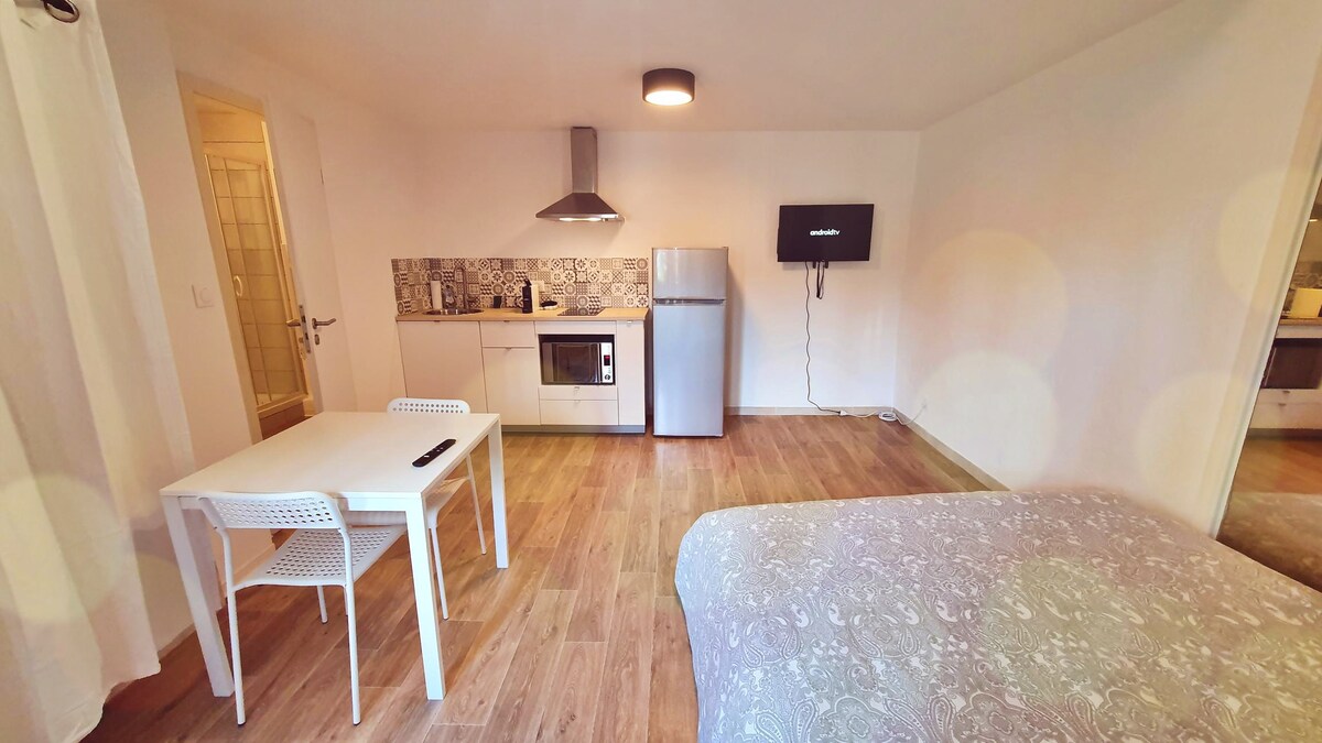 Pequeño estudio de unos 18 m2, situado frente al parque Jacquet. Está equipado con una cama alta (1 plaza) con un sofá cama justo debajo (2 plazas), un baño con inodoro y una pequeña cocina ( vajilla, vitrocerámica, microondas, nevera...). Tiene una pequeña dependencia con una lavadora. Hay televisor. Este alojamiento no es lujoso, pero es muy funcional. Acceso Wifi limitado a 40 GB por semana. Ideal para estancias largas: unas semanas a varios meses.