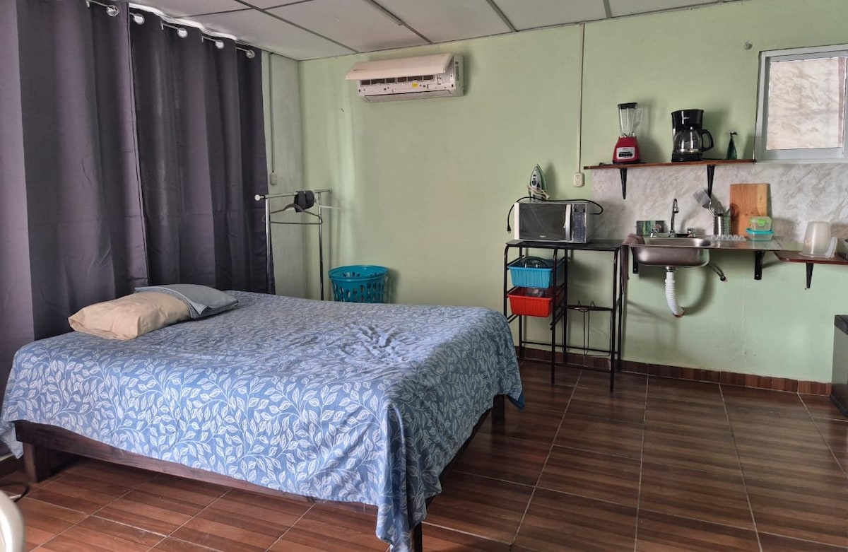 Hospédate en el corazón de Acayucan en un mini departamento práctico y acogedor, ideal para viajes de trabajo o descanso. Disfruta de una cama matrimonial cómoda, TV, clima y ventilador para tu confort. La cocina está equipada con minifrigo, cafetera, mesa y utensilios básicos, además de un sillón con mesa auxiliar, clóset y baño privado con espejo. Su ubicación céntrica te mantiene cerca de comercios, restaurantes y transporte, lo que hace tu estancia aún más práctica y agradable.