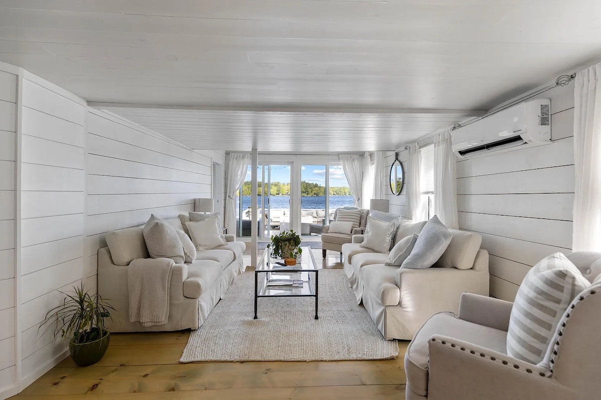Waterfront GLASS cabin with privacy professionally designed, escape to somewhere really special. Crooked river acres surrounding the house with the river wrapping around the property. Dock with direct access to Sebago lake and state park just minutes away, Outdoor shower, hot tub, hammocks, BIG walk-in shower w/ window. Heated bath floors, ac. See through Fireplace. The property has its own sandy swimming beach, pets are welcome. Come enjoy privacy and the space to run around seconds to Sebago.