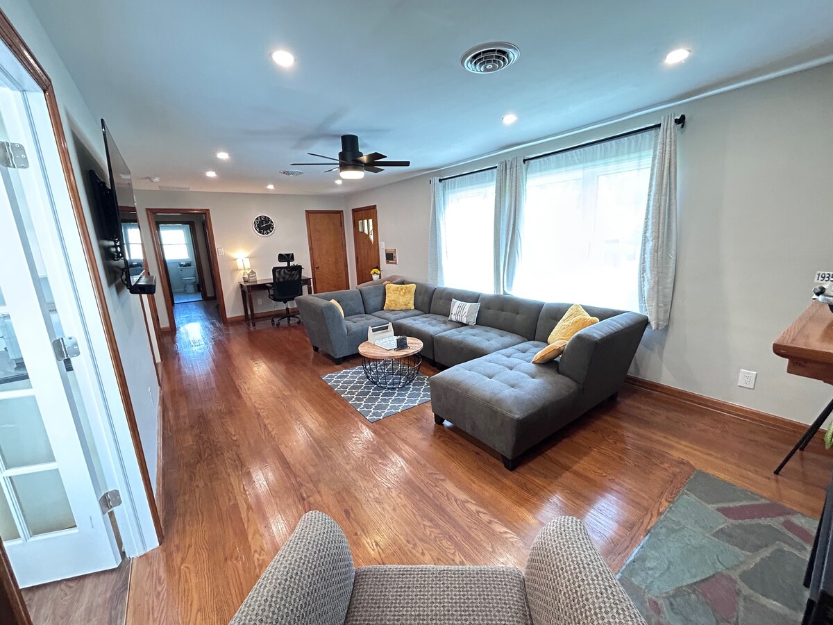 Book now for space, comfort, and all the amenities you need for a memorable stay • Spacious 1-Story floorplan • All-new kitchen & baths • Central Heat & Air Conditioning • 65" Smart TV & sound-bar in living room; Smart TVs in 1st & 3rd Bedrooms • 1 King, 2 Queen beds • Ample driveway parking • Each Bedroom has a Ceiling Fan, blackout curtains, 2 nightstands, hangers, luggage racks • 1st floor washer/dryer • Multiple work spaces • Whole Home Backup Generator • Fire Pit • Large Brand New Back Deck