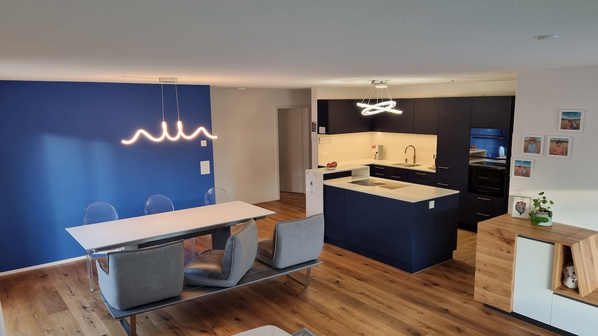 Family Loft NOALA – a stylish, family-friendly apartment just steps from lake Murten and the historic old town. Enjoy lake views, a fully equipped kitchen, and a spacious living-dining area. Two bathrooms plus washer and dryer are at your disposal. Accommodates up to 8 guests: 3 adults and 5 children. Parking is available close by (fees apply). Centrally located with a welcoming ambience – your perfect home away from home.
