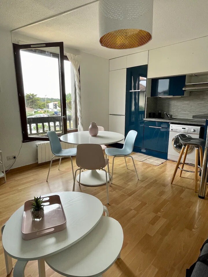 En planta baja de 35 m2 con terraza, totalmente renovado, frente a la duna y a 100 metros de la playa a pie. Podrá contemplar magníficas puestas de sol Los restaurantes, el excepcional mercado, el parque acuático están cerca, ¡sin necesidad de utilizar su vehículo! 1 salón con sofá cama, TV, wifi, cocina totalmente equipada (excepto lavavajillas) 1 dormitorio, cuarto de baño con inodoro. Un guardabicicletas común seguro está disponible en el edificio. A 10' de Hossegor, Capbreton, 30' de Bayona.