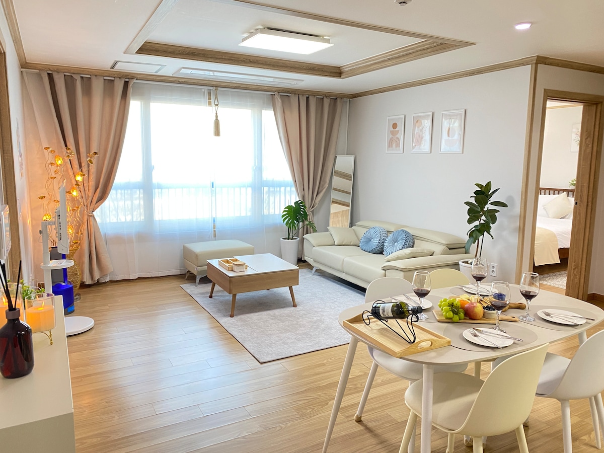 ¡Te damos la bienvenida a Stay Bom en la nueva ciudad de Godeok de Pyeongtaek! Nuestro Airbnb se encuentra justo enfrente del parque Hambaksan, el parque cultural ecológico más grande de Pyeongtaek, que abarca 670 000 metros cuadrados. Disfruta de una variedad de experiencias llenas de naturaleza, que incluyen pícnics, explorar arroyos pintorescos, descansar en refugios de vigilancia, utilizar instalaciones de fitness, jugar en parques infantiles, pasear por senderos forestales y caminar descalzo por senderos de suelo suave.