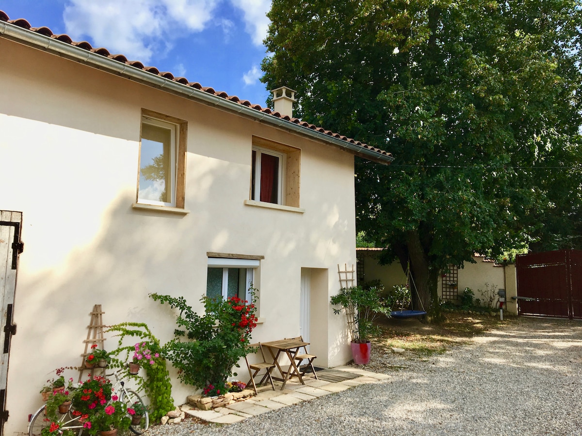 Charmante maison mitoyenne refaite à neuf avec des matériaux naturels, au calme de la campagne trés paisible. Rivière à 150 m idéale pour se ressourcer Randonnees, VTT etc. Les soirées privées sont interdites. Venez découvrir notre Région. Lyon 35 mntes, Vienne a 15 kms, festival du Jazz, Village de marque à 20 mntes, Festival Berlioz. Sur la route des Alpes ou de la Méditerranée. Cuisine équipée, 2 chambres, salle de bain, séche cheveux et 2 wc. Linges lit fournis mais pas les serviettes.