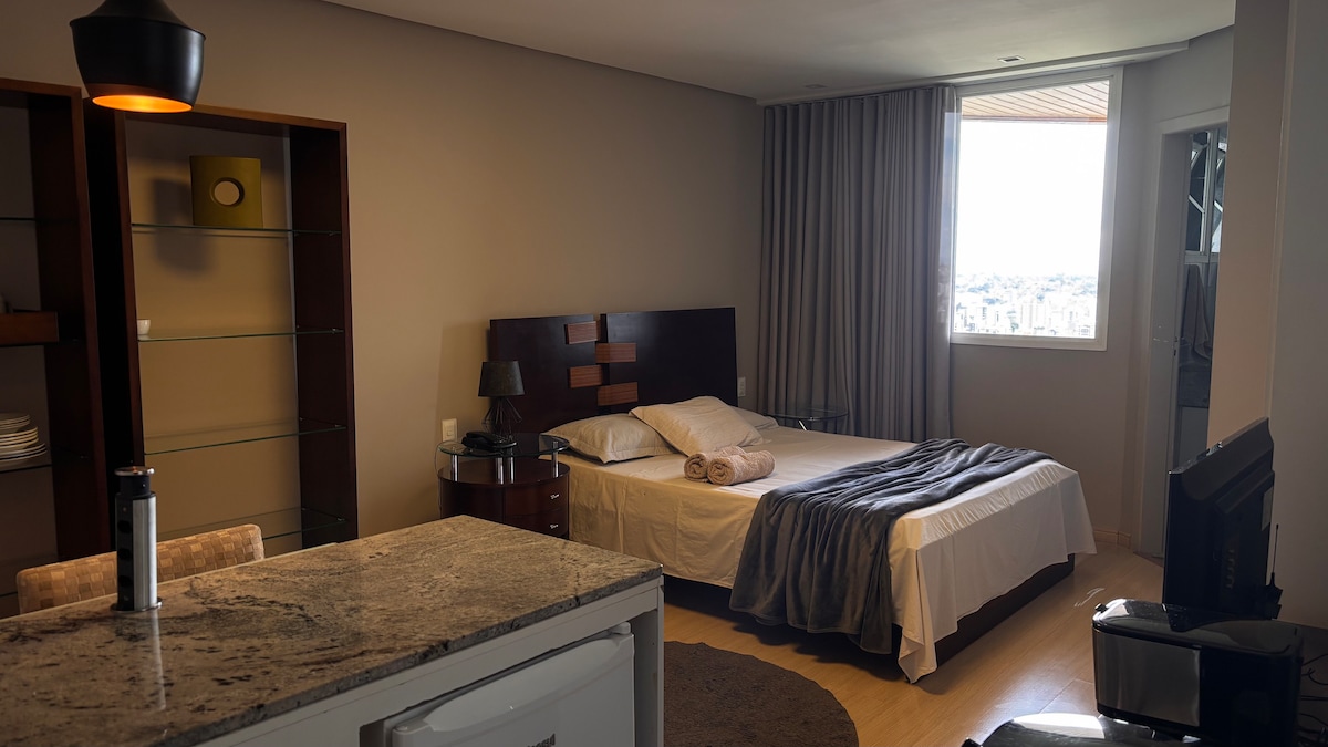 Con 70 m2 , para aquellos que buscan privacidad e independencia . En Savassi, a dos cuadras de Praça da Liberdade y Shopping Pátio Savassi. Con una suite, baño social reversible, sofá cama para los huéspedes, ventana de la suite antirruido, habitación con aire acondicionado y habitación, wifi 300 megas, smartv de 75 pulgadas, Hometheater, cocina completa, microondas, servicio de habitaciones, camarera, valet, piscina , gimnasio, sauna, restaurante y conserje las 24 horas.